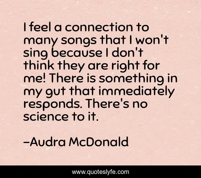 This page presents the quote "I feel a connection to many songs that I won't sing because I don't think they are right for me! There is something in my gut that immediately responds. There's no science to it.". Author of this quote is Audra McDonald. This quote is about me, think, gut,.