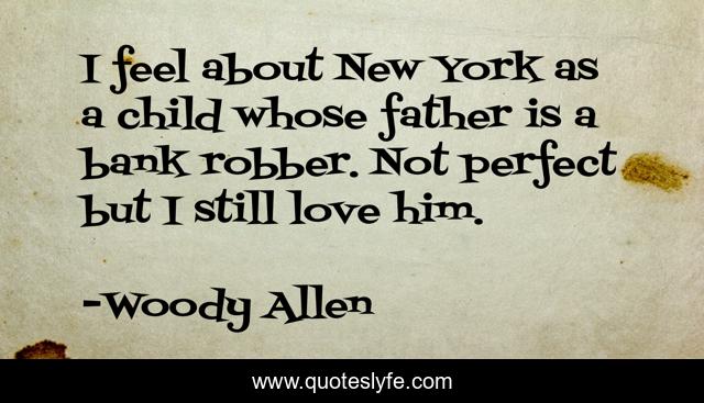 This page presents the quote "I feel about New York as a child whose father is a bank robber. Not perfect but I still love him.". Author of this quote is Woody Allen. This quote is about travel, cities,.