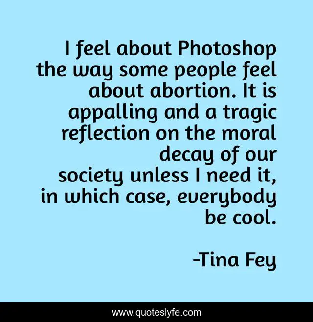 This page presents the quote "I feel about Photoshop the way some people feel about abortion. It is appalling and a tragic reflection on the moral decay of our society…unless I need it, in which case, everybody be cool.". Author of this quote is Tina Fey. This quote is about bossypants, humor, memoir,.