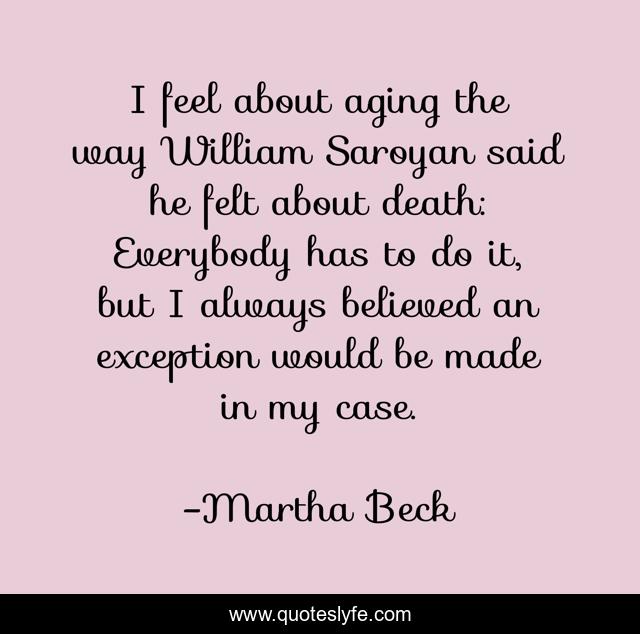 This page presents the quote "I feel about aging the way William Saroyan said he felt about death: Everybody has to do it, but I always believed an exception would be made in my case.". Author of this quote is Martha Beck. This quote is about aging, said, way,.