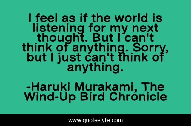 This page presents the quote "I feel as if the world is listening for my next thought. But I can't think of anything. Sorry, but I just can't think of anything.". Author of this quote is Haruki Murakami, The Wind-Up Bird Chronicle. This quote is about life, thoughts,.