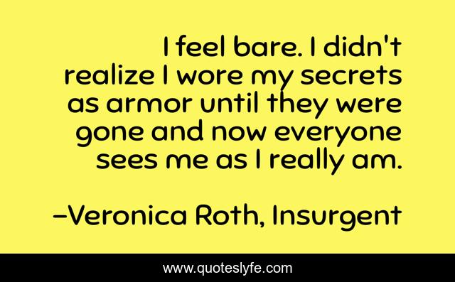 This page presents the quote "I feel bare. I didn't realize I wore my secrets as armor until they were gone and now everyone sees me as I really am.". Author of this quote is Veronica Roth, Insurgent. This quote is about armor, secrets,.