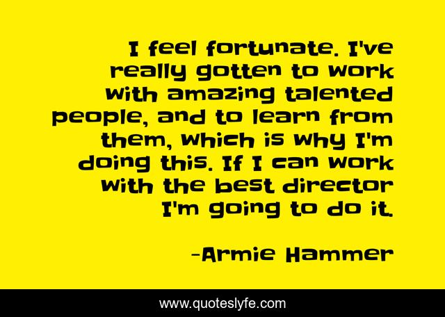 This page presents the quote "I feel fortunate. I've really gotten to work with amazing talented people, and to learn from them, which is why I'm doing this. If I can work with the best director I'm going to do it.". Author of this quote is Armie Hammer. This quote is about work, best, people,.