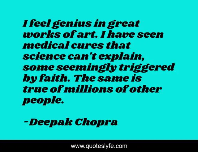 This page presents the quote "I feel genius in great works of art. I have seen medical cures that science can't explain, some seemingly triggered by faith. The same is true of millions of other people.". Author of this quote is Deepak Chopra. This quote is about faith, art, science,.
