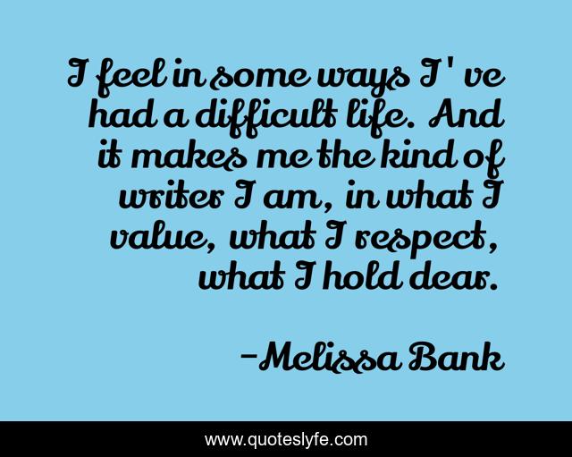 This page presents the quote "I feel in some ways I've had a difficult life. And it makes me the kind of writer I am, in what I value, what I respect, what I hold dear.". Author of this quote is Melissa Bank. This quote is about life, value,.