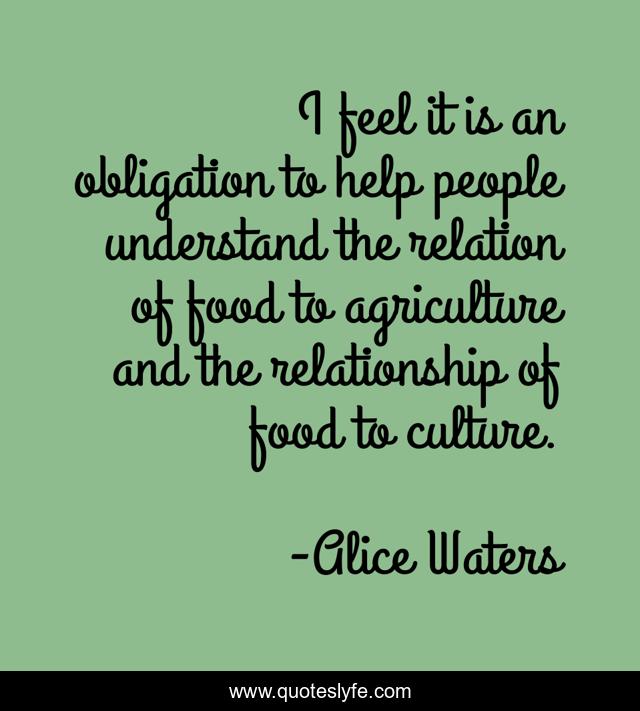 This page presents the quote "I feel it is an obligation to help people understand the relation of food to agriculture and the relationship of food to culture.". Author of this quote is Alice Waters. This quote is about culture, help, relationship,.