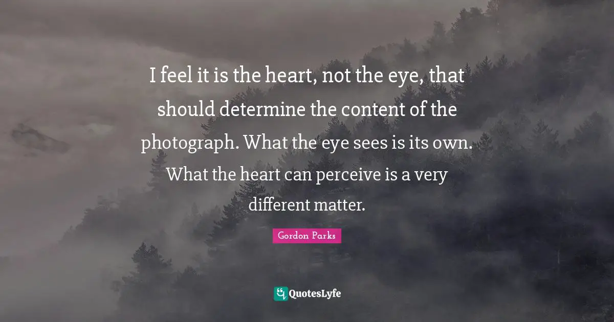 This page presents the quote "I feel it is the heart, not the eye, that should determine the content of the photograph. What the eye sees is its own. What the heart can perceive is a very different matter.". Author of this quote is Gordon Parks. This quote is about perceive, matter, eye, heart, photograph, determine, different,.