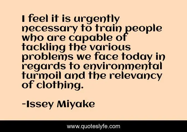 This page presents the quote "I feel it is urgently necessary to train people who are capable of tackling the various problems we face today in regards to environmental turmoil and the relevancy of clothing.". Author of this quote is Issey Miyake. This quote is about problems, today, people,.