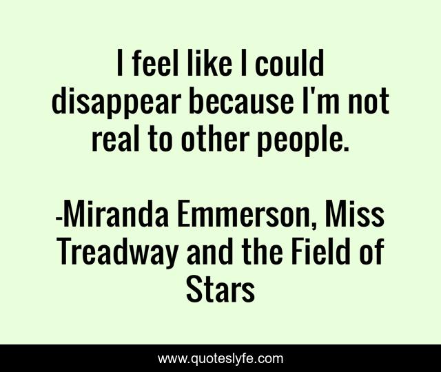 This page presents the quote "I feel like I could disappear because I'm not real to other people.". Author of this quote is Miranda Emmerson, Miss Treadway and the Field of Stars. This quote is about loneliness, disappear,.