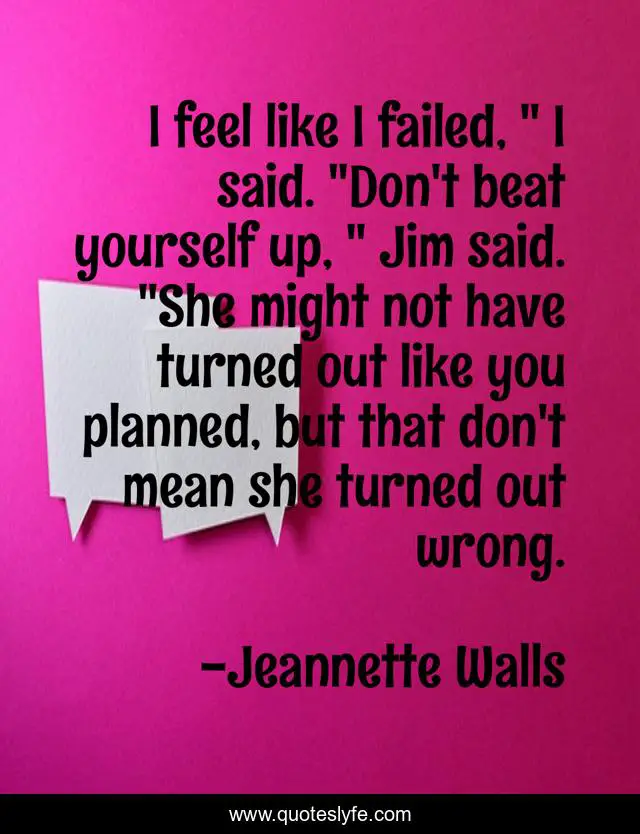 This page presents the quote "I feel like I failed, " I said. "Don't beat yourself up, " Jim said. "She might not have turned out like you planned, but that don't mean she turned out wrong.". Author of this quote is Jeannette Walls. .