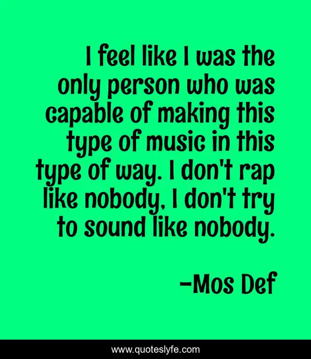 This page presents the quote "I feel like I was the only person who was capable of making this type of music in this type of way. I don't rap like nobody, I don't try to sound like nobody.". Author of this quote is Mos Def. This quote is about try, person, way,.