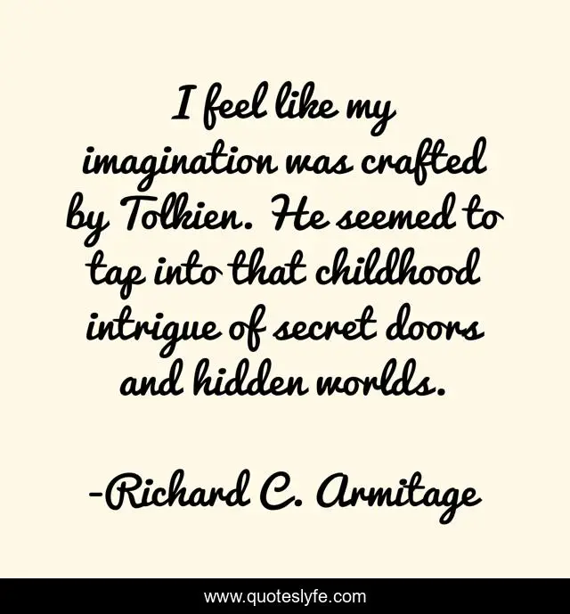 This page presents the quote "I feel like my imagination was crafted by Tolkien. He seemed to tap into that childhood intrigue of secret doors and hidden worlds.". Author of this quote is Richard C. Armitage. This quote is about secret, childhood, doors,.