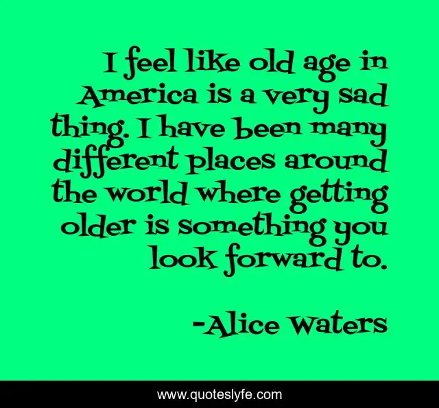 This page presents the quote "I feel like old age in America is a very sad thing. I have been many different places around the world where getting older is something you look forward to.". Author of this quote is Alice Waters. This quote is about world, america, sad,.
