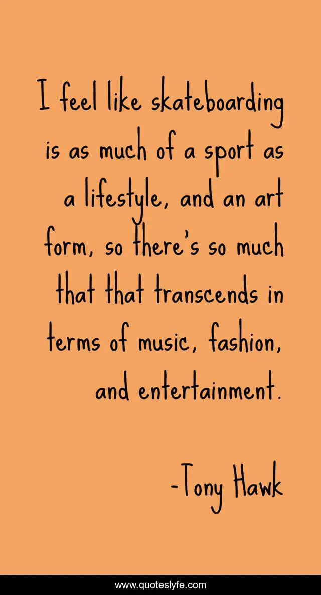This page presents the quote "I feel like skateboarding is as much of a sport as a lifestyle, and an art form, so there's so much that that transcends in terms of music, fashion, and entertainment.". Author of this quote is Tony Hawk. This quote is about fashion, art, entertainment,.