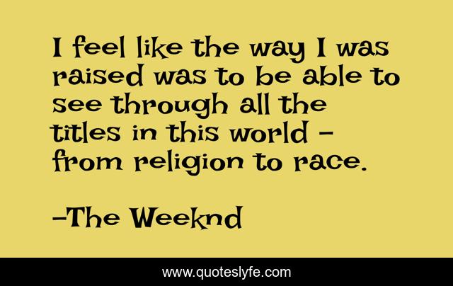 This page presents the quote "I feel like the way I was raised was to be able to see through all the titles in this world - from religion to race.". Author of this quote is The Weeknd. This quote is about world, see, way,.