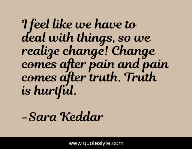 This page presents the quote "I feel like we have to deal with things, so we realize change! Change comes after pain and pain comes after truth. Truth is hurtful.". Author of this quote is Sara Keddar. This quote is about life, pain, quote, hurt, realistic, truth,.