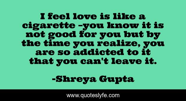 This page presents the quote "I feel love is like a cigarette –you know it is not good for you but by the time you realize, you are so addicted to it that you can't leave it.". Author of this quote is Shreya Gupta. This quote is about crush, lovers,.