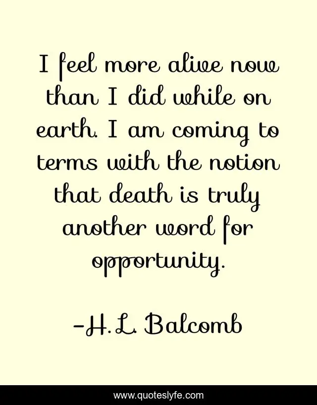 This page presents the quote "I feel more alive now than I did while on earth. I am coming to terms with the notion that death is truly another word for opportunity.". Author of this quote is H. L. Balcomb. This quote is about life-and-living, individuality, death, afterlife, spirituality, life-changing, now, opportunity, hope,.