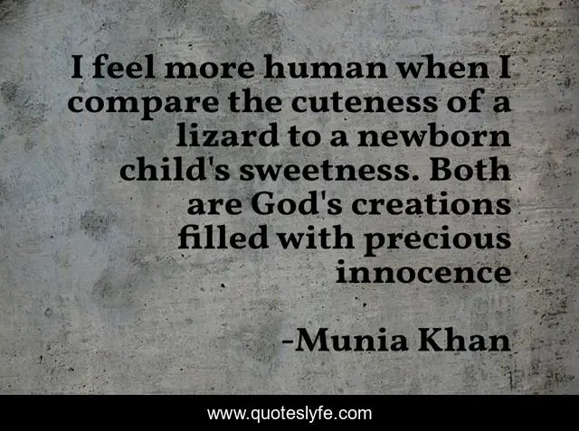 This page presents the quote "I feel more human when I compare the cuteness of a lizard to a newborn child's sweetness. Both are God's creations filled with precious innocence". Author of this quote is Munia Khan. This quote is about beautiful, compare, sweet, creation, reptile, newborn, philosophical, human, god-s-love,.