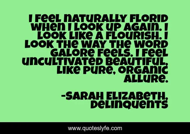 This page presents the quote "I feel naturally florid when I look up again. I look like a flourish. I look the way the word galore feels. I feel uncultivated beautiful, like pure, organic allure.". Author of this quote is Sarah Elizabeth, Delinquents. .