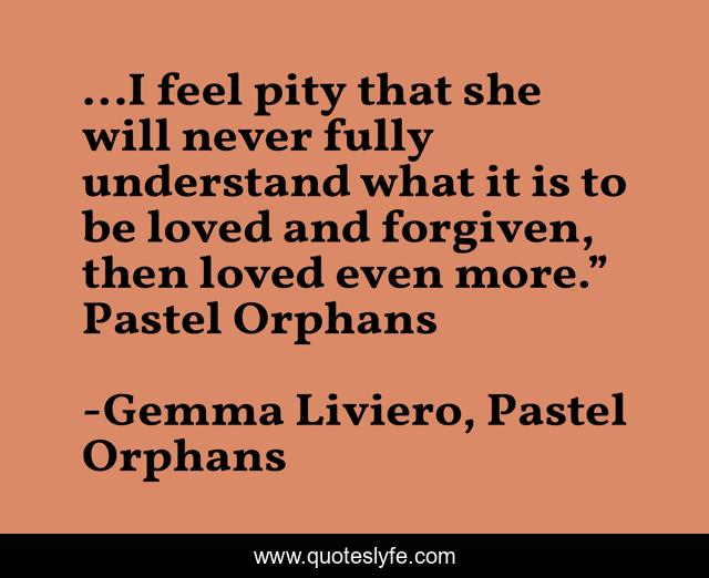 This page presents the quote "...I feel pity that she will never fully understand what it is to be loved and forgiven, then loved even more.” Pastel Orphans". Author of this quote is Gemma Liviero, Pastel Orphans. This quote is about forgiveness, love, affection,.
