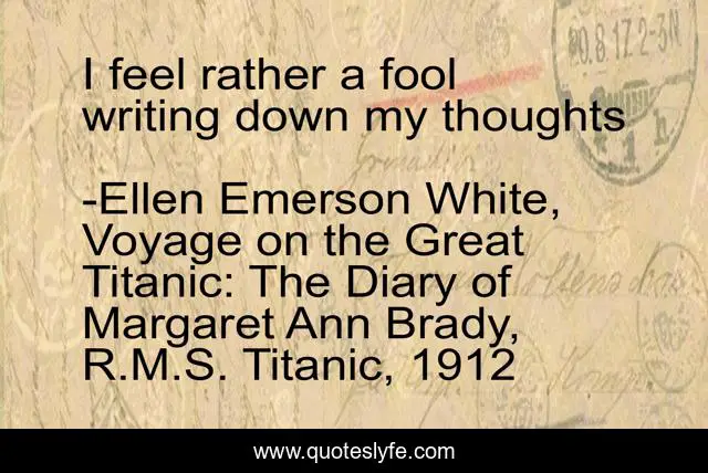 This page presents the quote "I feel rather a fool writing down my thoughts". Author of this quote is Ellen Emerson White, Voyage on the Great Titanic: The Diary of Margaret Ann Brady, R.M.S. Titanic, 1912. This quote is about titanic, margaret-ann-brady, thoughts, writing,.