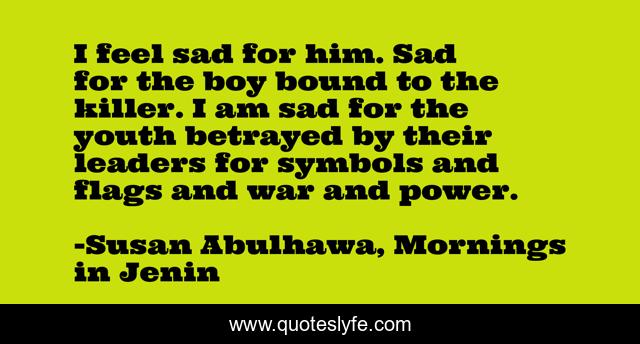 This page presents the quote "I feel sad for him. Sad for the boy bound to the killer. I am sad for the youth betrayed by their leaders for symbols and flags and war and power.". Author of this quote is Susan Abulhawa, Mornings in Jenin. This quote is about youth, war,.