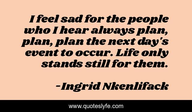 This page presents the quote "I feel sad for the people who I hear always plan, plan, plan the next day's event to occur. Life only stands still for them.". Author of this quote is Ingrid Nkenlifack. This quote is about circles, faith, life, organization, repeas, cycle-of-life, living, life-s-mysteries, alive,.