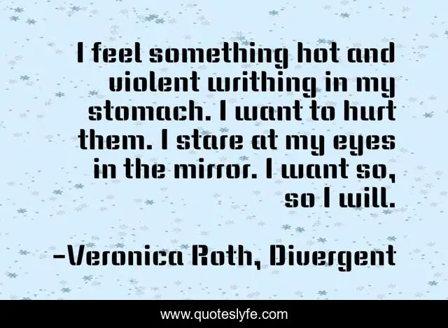 This page presents the quote "I feel something hot and violent writhing in my stomach. I want to hurt them. I stare at my eyes in the mirror. I want so, so I will.". Author of this quote is Veronica Roth, Divergent. This quote is about tris-prior, revenge,.