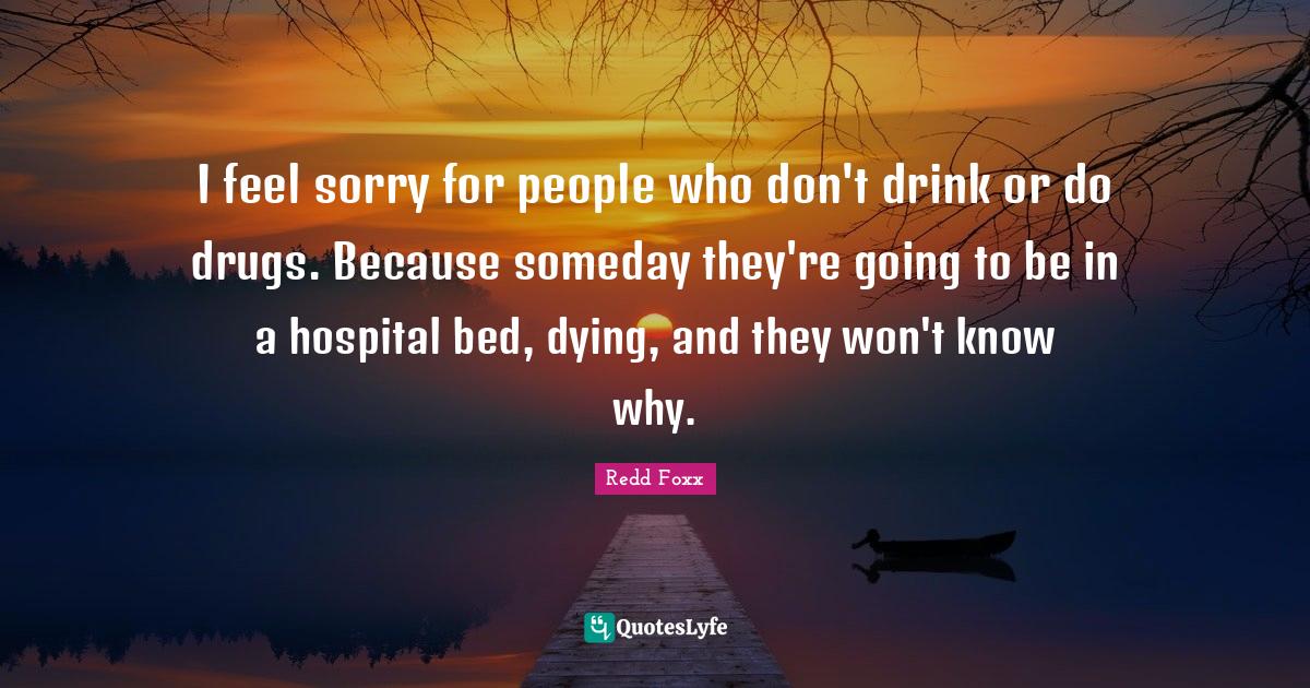 This page presents the quote "I feel sorry for people who don't drink or do drugs. Because someday they're going to be in a hospital bed, dying, and they won't know why.". Author of this quote is Redd Foxx. This quote is about sorry, people, bed, drug, someday, dying, drink,.