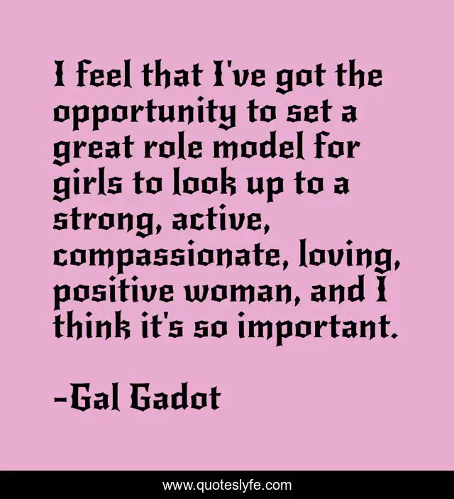 This page presents the quote "I feel that I've got the opportunity to set a great role model for girls to look up to a strong, active, compassionate, loving, positive woman, and I think it's so important.". Author of this quote is Gal Gadot. This quote is about great, strong, opportunity,.