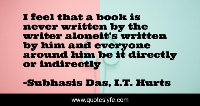 This page presents the quote "I feel that a book is never written by the writer aloneit's written by him and everyone around him be it directly or indirectly". Author of this quote is Subhasis Das, I.T. Hurts. .
