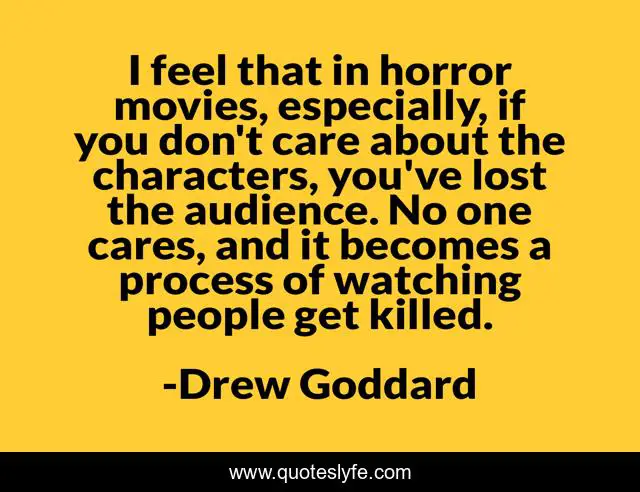 This page presents the quote "I feel that in horror movies, especially, if you don't care about the characters, you've lost the audience. No one cares, and it becomes a process of watching people get killed.". Author of this quote is Drew Goddard. This quote is about people, lost, care,.