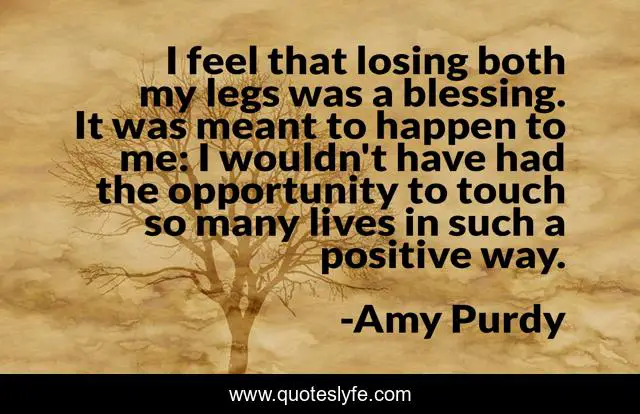 This page presents the quote "I feel that losing both my legs was a blessing. It was meant to happen to me: I wouldn't have had the opportunity to touch so many lives in such a positive way.". Author of this quote is Amy Purdy. This quote is about losing, me, opportunity,.
