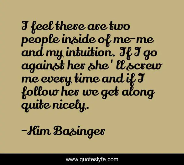 This page presents the quote "I feel there are two people inside of me-me and my intuition. If I go against her she'll screw me every time and if I follow her we get along quite nicely.". Author of this quote is Kim Basinger. .