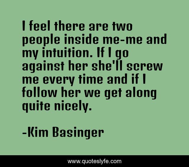 This page presents the quote "I feel there are two people inside me-me and my intuition. If I go against her she'll screw me every time and if I follow her we get along quite nicely.". Author of this quote is Kim Basinger. .