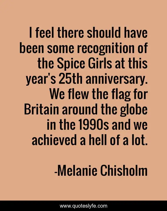 This page presents the quote "I feel there should have been some recognition of the Spice Girls at this year's 25th anniversary. We flew the flag for Britain around the globe in the 1990s and we achieved a hell of a lot.". Author of this quote is Melanie Chisholm. This quote is about hell, flag, spice,.