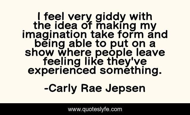 This page presents the quote "I feel very giddy with the idea of making my imagination take form and being able to put on a show where people leave feeling like they've experienced something.". Author of this quote is Carly Rae Jepsen. This quote is about feeling, idea, people,.