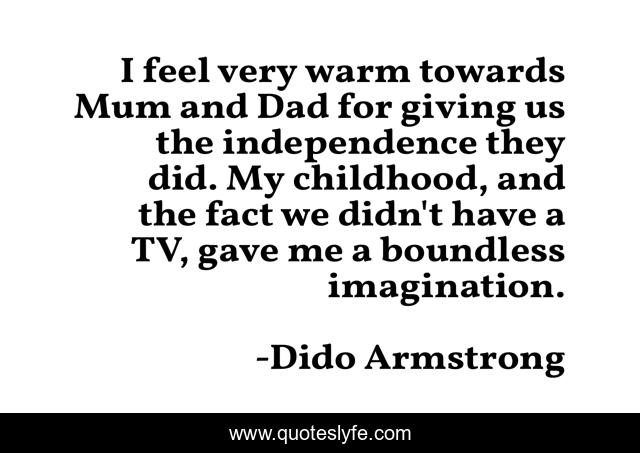 This page presents the quote "I feel very warm towards Mum and Dad for giving us the independence they did. My childhood, and the fact we didn't have a TV, gave me a boundless imagination.". Author of this quote is Dido Armstrong. This quote is about me, imagination, childhood,.