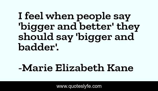 This page presents the quote "I feel when people say 'bigger and better' they should say 'bigger and badder'.". Author of this quote is Marie Elizabeth Kane. This quote is about possession, ownership,.