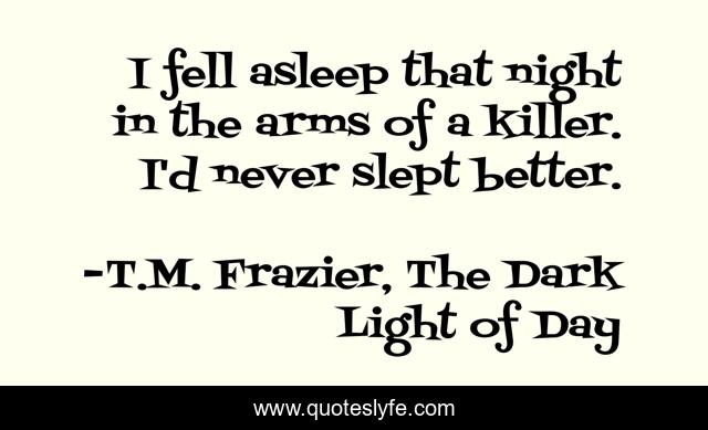 This page presents the quote "I fell asleep that night in the arms of a killer. I'd never slept better.". Author of this quote is T.M. Frazier, The Dark Light of Day. This quote is about new-adult, dark-fiction,.