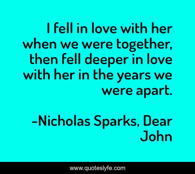 This page presents the quote "I fell in love with her when we were together, then fell deeper in love with her in the years we were apart.". Author of this quote is Nicholas Sparks, Dear John. This quote is about love, separation, affection,.