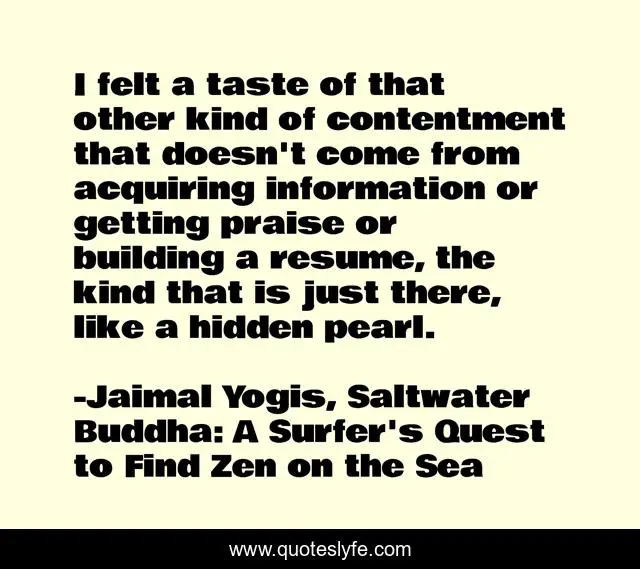 This page presents the quote "I felt a taste of that other kind of contentment that doesn't come from acquiring information or getting praise or building a resume, the kind that is just there, like a hidden pearl.". Author of this quote is Jaimal Yogis, Saltwater Buddha: A Surfer's Quest to Find Zen on the Sea. This quote is about being-content, contentment,.