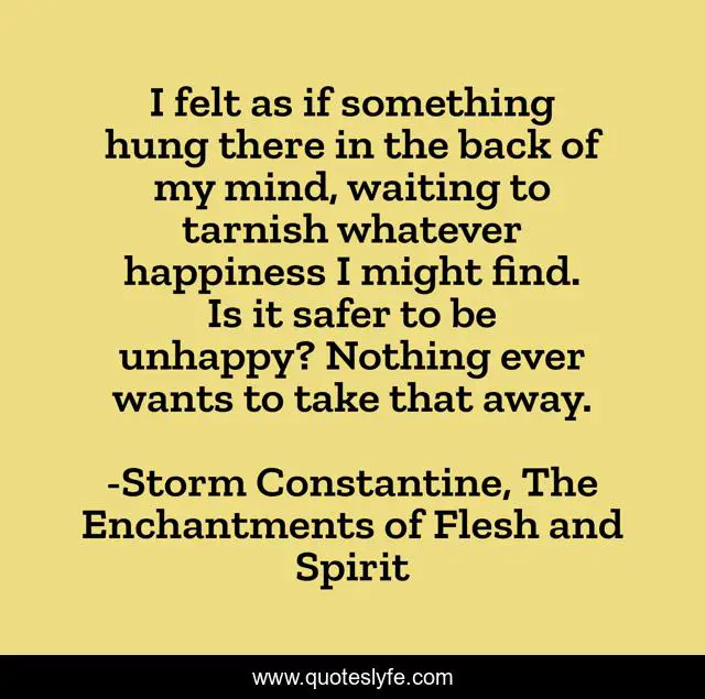 This page presents the quote "I felt as if something hung there in the back of my mind, waiting to tarnish whatever happiness I might find. Is it safer to be unhappy? Nothing ever wants to take that away.". Author of this quote is Storm Constantine, The Enchantments of Flesh and Spirit. This quote is about life, the-unknown, sadness, depression, unhappiness,.