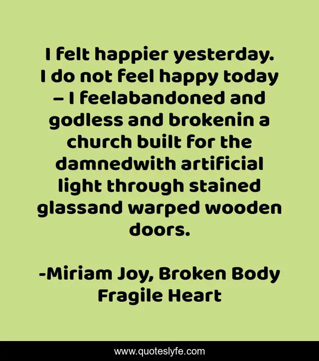 "Miriam Joy, Broken Body Fragile Heart Quotes." Quoteslyfe.com, 2025. Fri. 05 Dec. 2025. <https://www.quoteslyfe.com/quote/I-felt-happier-yesterday-I-do-not-114005>.