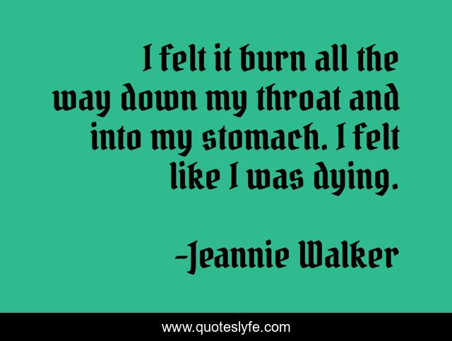 This page presents the quote "I felt it burn all the way down my throat and into my stomach. I felt like I was dying.". Author of this quote is Jeannie Walker. This quote is about murder-mystery, adult-non-fiction, thriller, true-crime,.