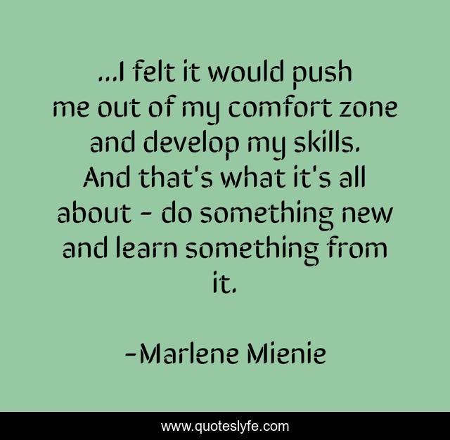 This page presents the quote "...I felt it would push me out of my comfort zone and develop my skills. And that's what it's all about - do something new and learn something from it.". Author of this quote is Marlene Mienie. This quote is about challenge, comfort-zone, knowledge, motivation, inspiration,.