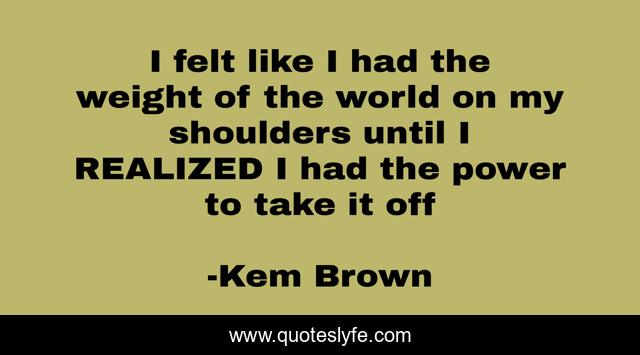 This page presents the quote "I felt like I had the weight of the world on my shoulders until I REALIZED I had the power to take it off". Author of this quote is Kem Brown. This quote is about confidence, positive, motivational, transformational, optimistic, inspirational, enthusiasm,.