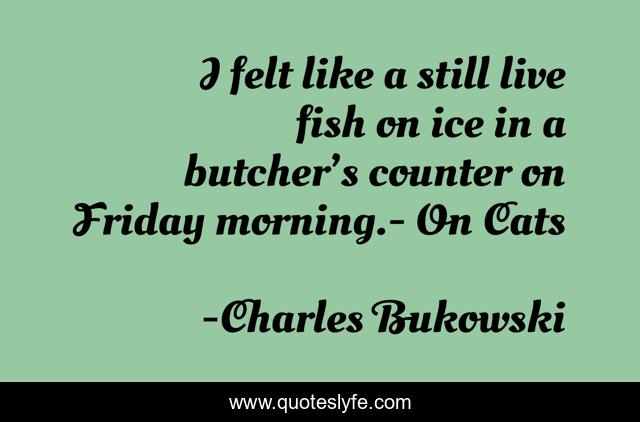 This page presents the quote "I felt like a still live fish on ice in a butcher’s counter on Friday morning.- On Cats". Author of this quote is Charles Bukowski. This quote is about devastation, cats,.