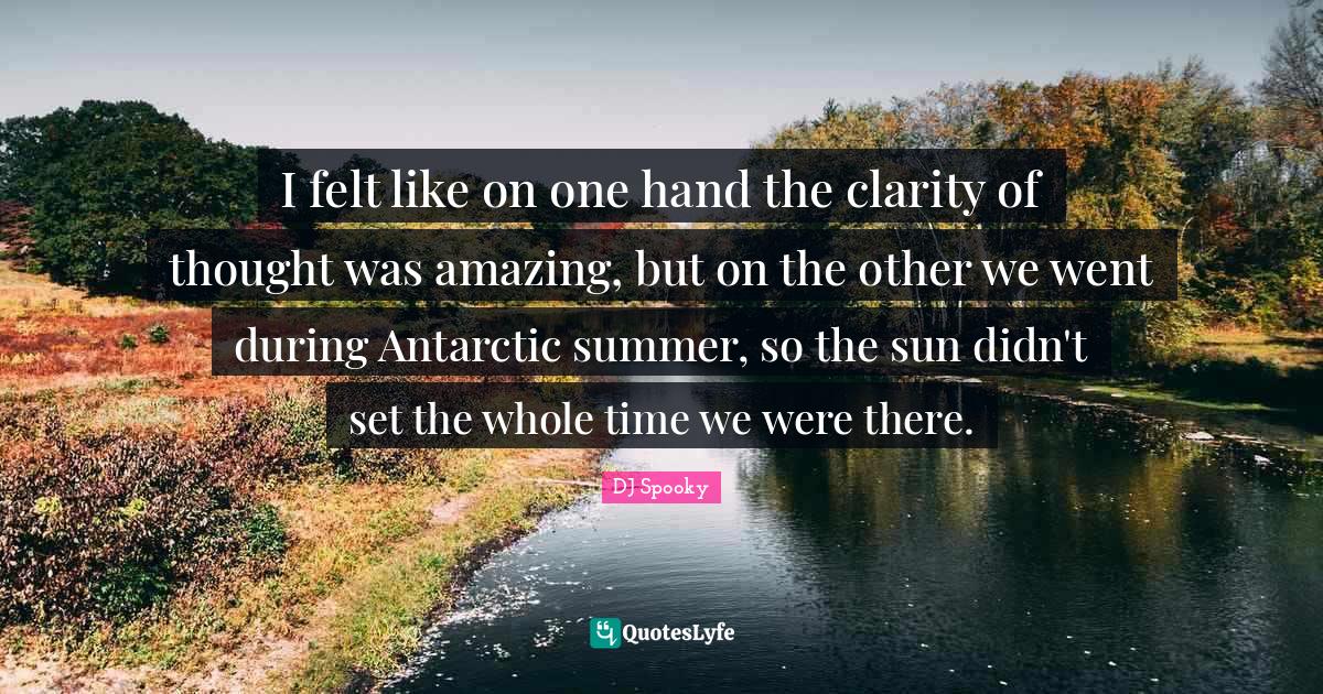 This page presents the quote "I felt like on one hand the clarity of thought was amazing, but on the other we went during Antarctic summer, so the sun didn't set the whole time we were there.". Author of this quote is DJ Spooky. This quote is about time, sun, hands, summer, whole, felt, clarity of thought,.